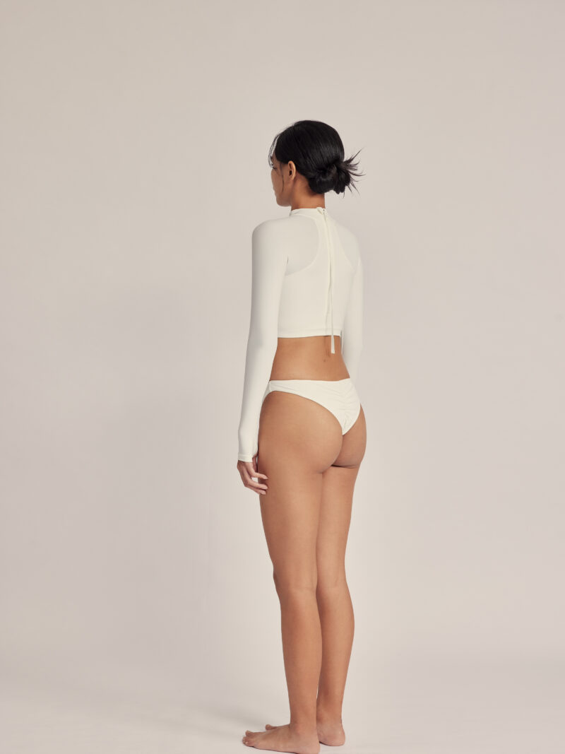 - 下擺剛好收束於胸下,營造乾淨俐落的短版比例。
